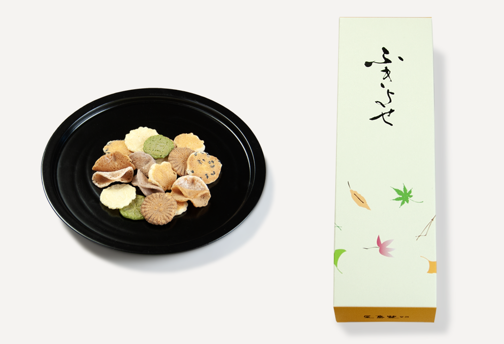 木の葉が風で一処に吹き寄せられた様に見立てた生姜、胡麻、抹茶などのお味のお菓子の詰め合わせでございます