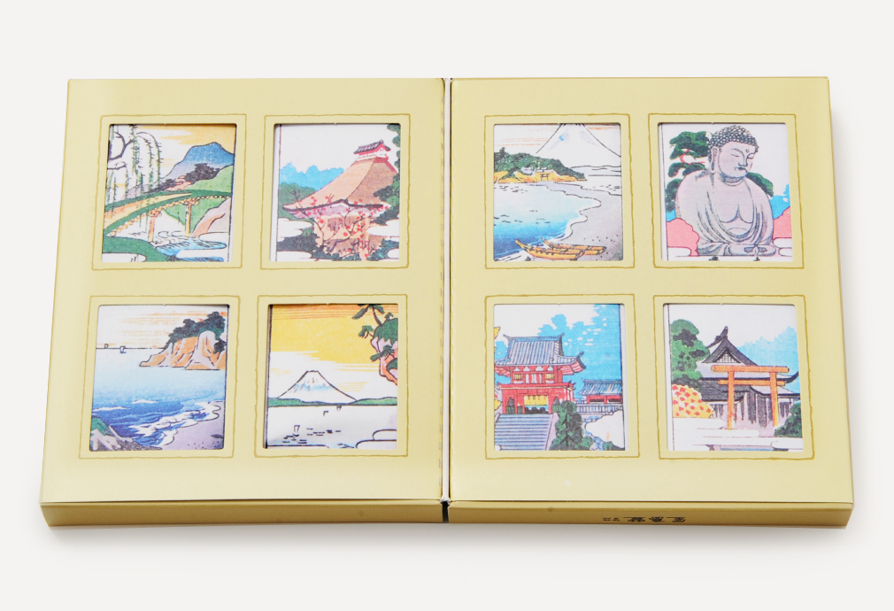 古来名所旧蹟の数多い鎌倉の中より、八景を選び、錦絵風の帯封をしました懐中汁粉でございます。お椀一杯の熱湯をお注ぎ頂きますと美味しいお汁粉になります。尚、手鍋などにてさーっと一煮立ちさせて頂きますと風味は一層増して参ります。