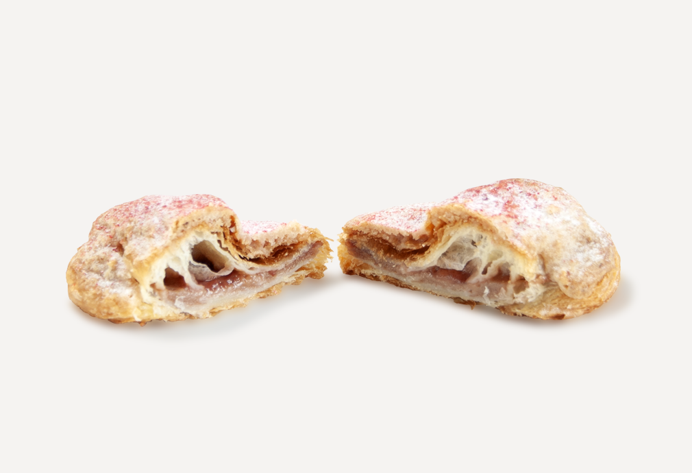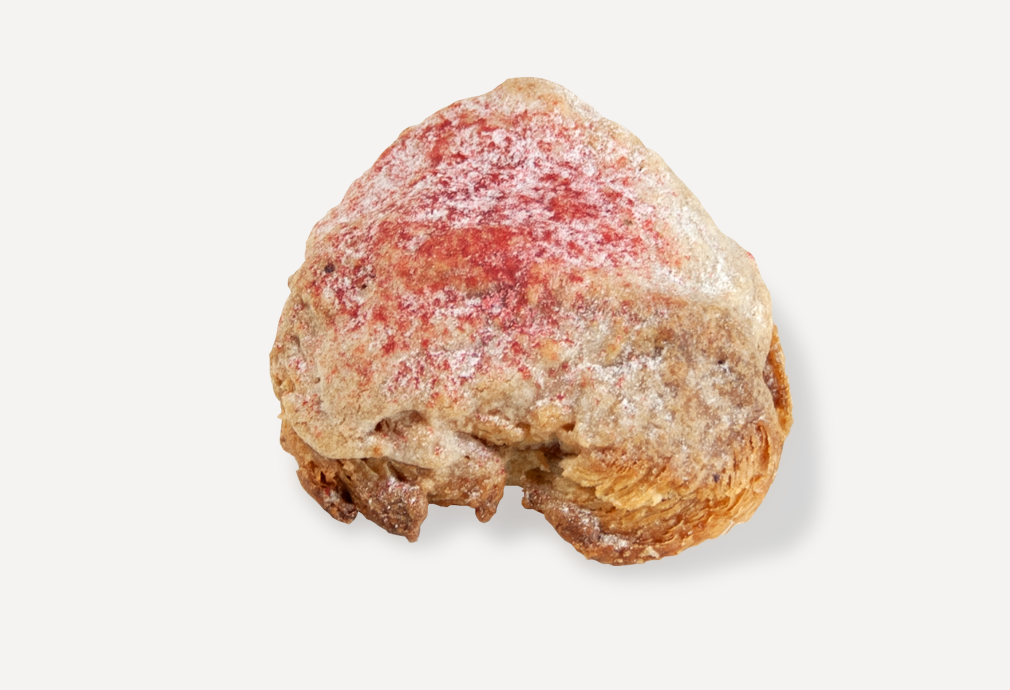 クロワッサン生地にイチゴジャムとイチゴカスタードをはさみダマンドクリームをかけたパンです