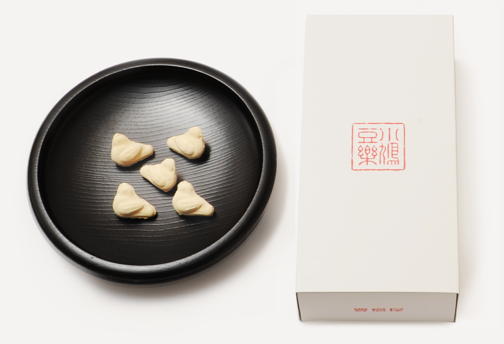可愛らしいふっくらとした小鳩の形状に、豆粉に和三盆などを配し打ち上げた独特の風味は、その豆の香を楽しんでいただき、又マメに楽しくお過ごしいただく様にとの願いをこめたものでもございます